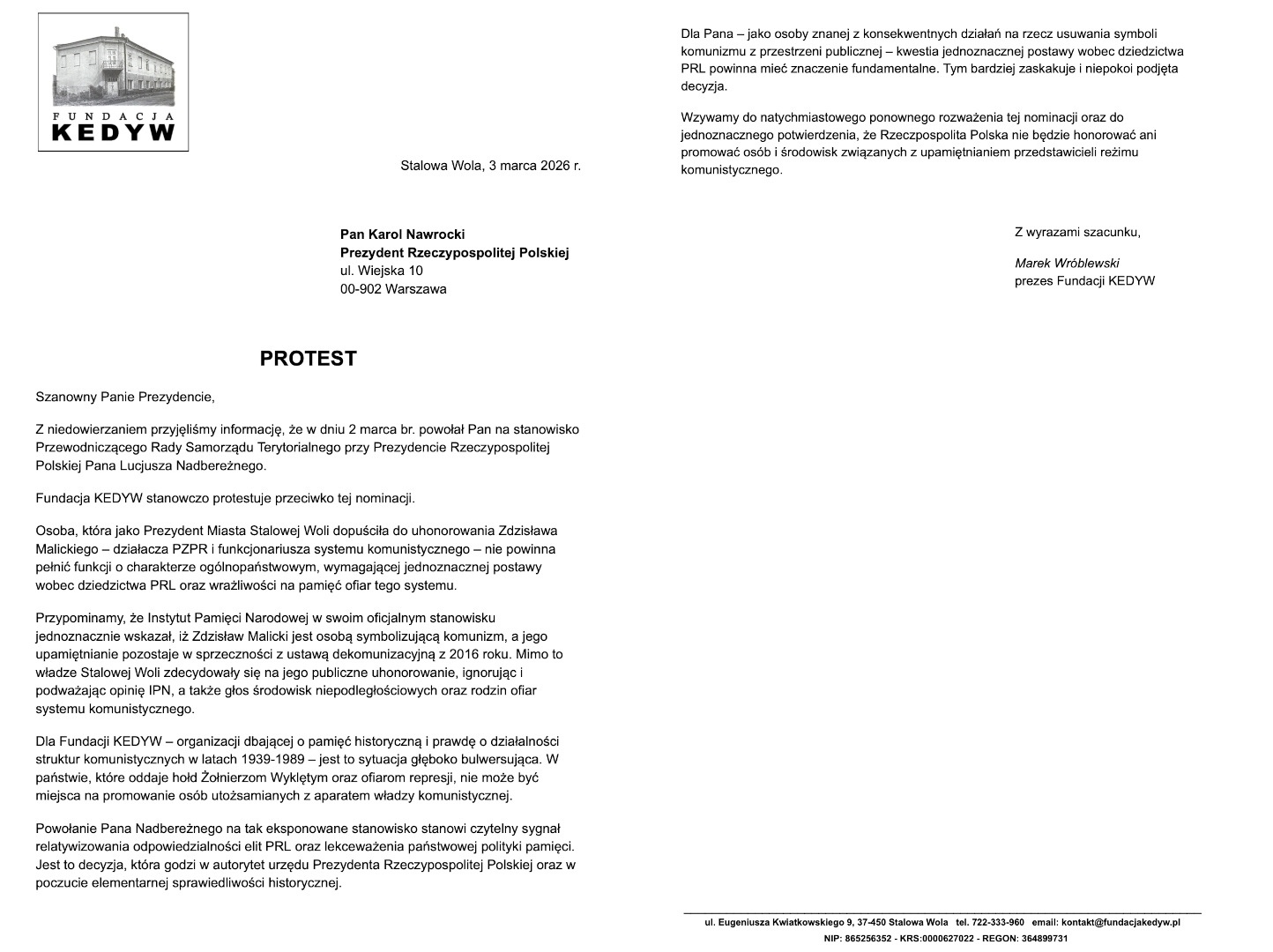 Fundacja KEDYW skierowała dziś oficjalny list protestacyjny do Prezydenta RP Karola Nawrockiego w związku z powołaniem Lucjusza Nadbereżnego na funkcję Przewodniczącego Rady Samorządu Terytorialnego przy Prezydencie RP.