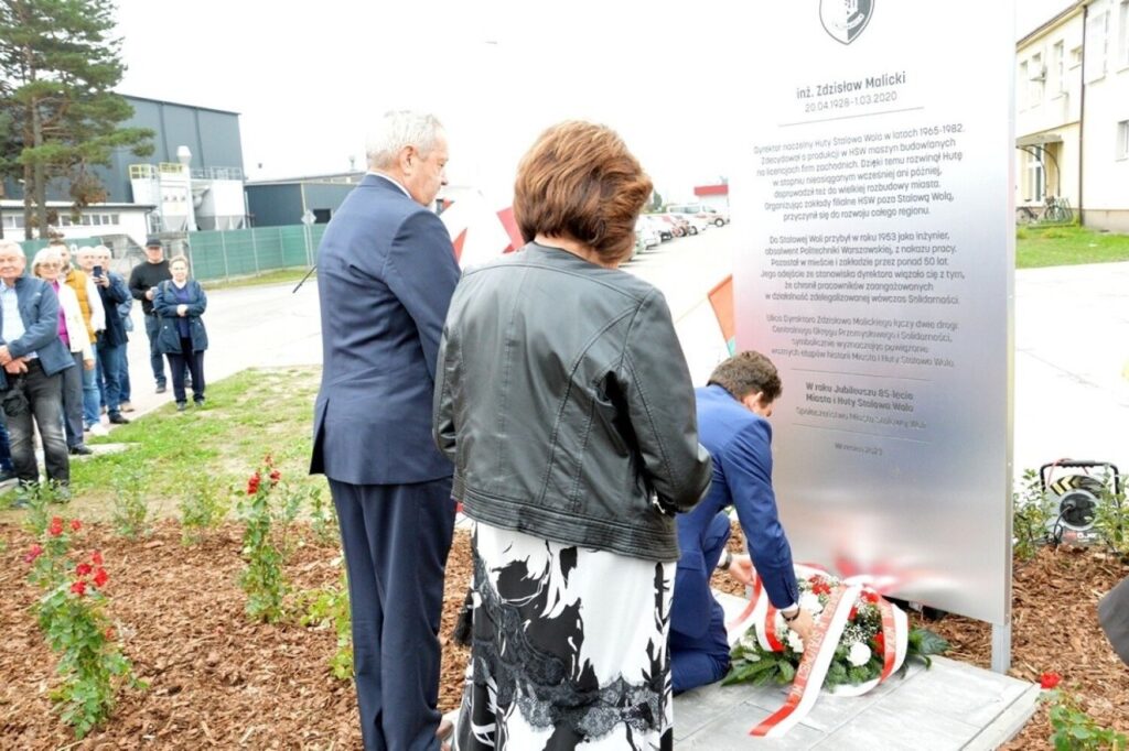 Poniżej Prezydent Stalowej Woli Lucjusz Nadbereżny 30 września 2023 r. odaje hołd komuniście tow. Zdzisławowi Malickiemu podczas odsłonięcia ulicy i pomnika na cześć Malickiego. Na zdjęciu od Lewej: tow. Jerzy Augustyn (PZPR), były przewodniczący ZSMP, PRON, tow. Joanna Grobel-Proszowska (PZPR), była Poseł na Sejm PRL, prezydent Lucjusz Nadbereżny (PiS) . (fot. Z. Surowaniec)