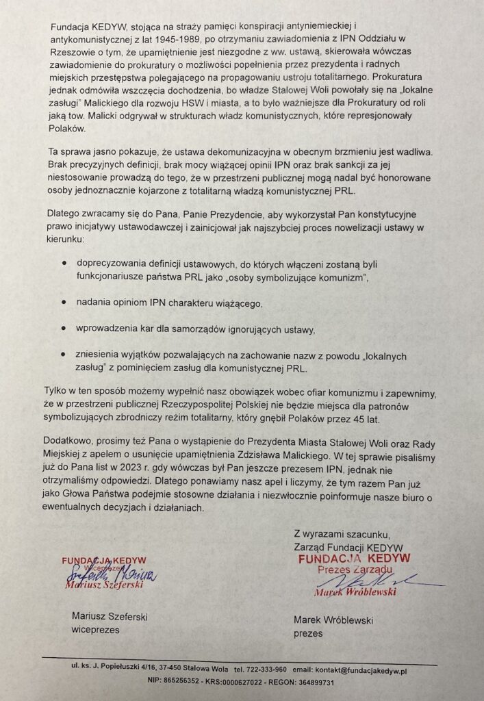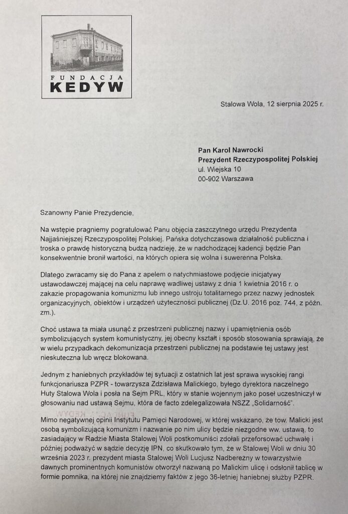 Dodatkowo, prosimy też Pana o wystąpienie do Prezydenta Miasta Stalowej Woli oraz Rady Miejskiej z apelem o usunięcie upamiętnienia Zdzisława Malickiego. W tej sprawie pisaliśmy już do Pana list w 2023 r. gdy wówczas był Pan jeszcze prezesem IPN, jednak nie otrzymaliśmy odpowiedzi. Dlatego ponawiamy nasz apel i liczymy, że tym razem Pan już jako Głowa Państwa podejmie stosowne działania i niezwłocznie poinformuje nasze biuro o ewentualnych decyzjach i działaniach.
