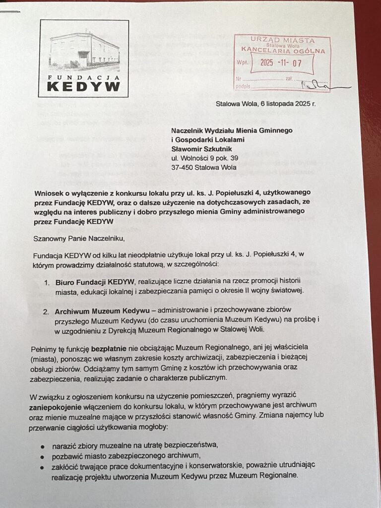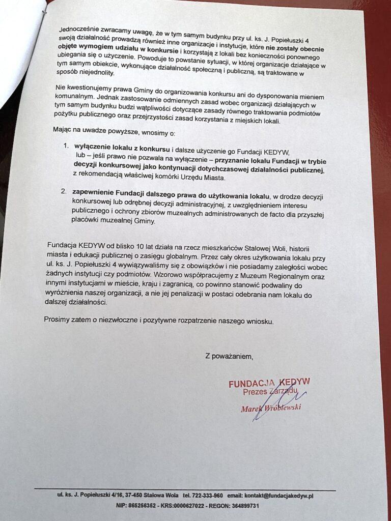 Fundacja KEDYW jako pozarządowa organizacja publiczna działa w Stalowej Woli prawie 10 lat – bezinteresownie promując historię miasta, prowadząc edukację, badania, dokumentację wojenną i opiekę nad zbiorami przyszłego Muzeum Kedywu. Nigdy nie mieliśmy zaległości wobec instytucji publicznych, wzorowo współpracujemy z Muzeum Regionalnym i wieloma podmiotami w kraju i za granicą. Dlatego decyzja o objęciu naszego lokalu konkursem jest niedocenieniem naszej bezinteresownej pracy wykonywanej na rzecz miasta i jest wprost decyzją krzywdzącą i godzącą w dobro publiczne, która bezpośrednio zagrozi realizacji projektu Muzeum Kedywu i współpracy z Muzeum Regionalnym w Stalowej Woli.