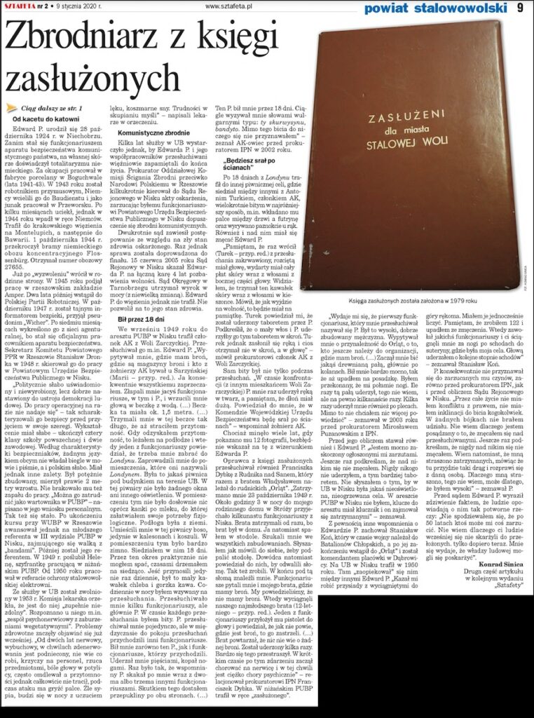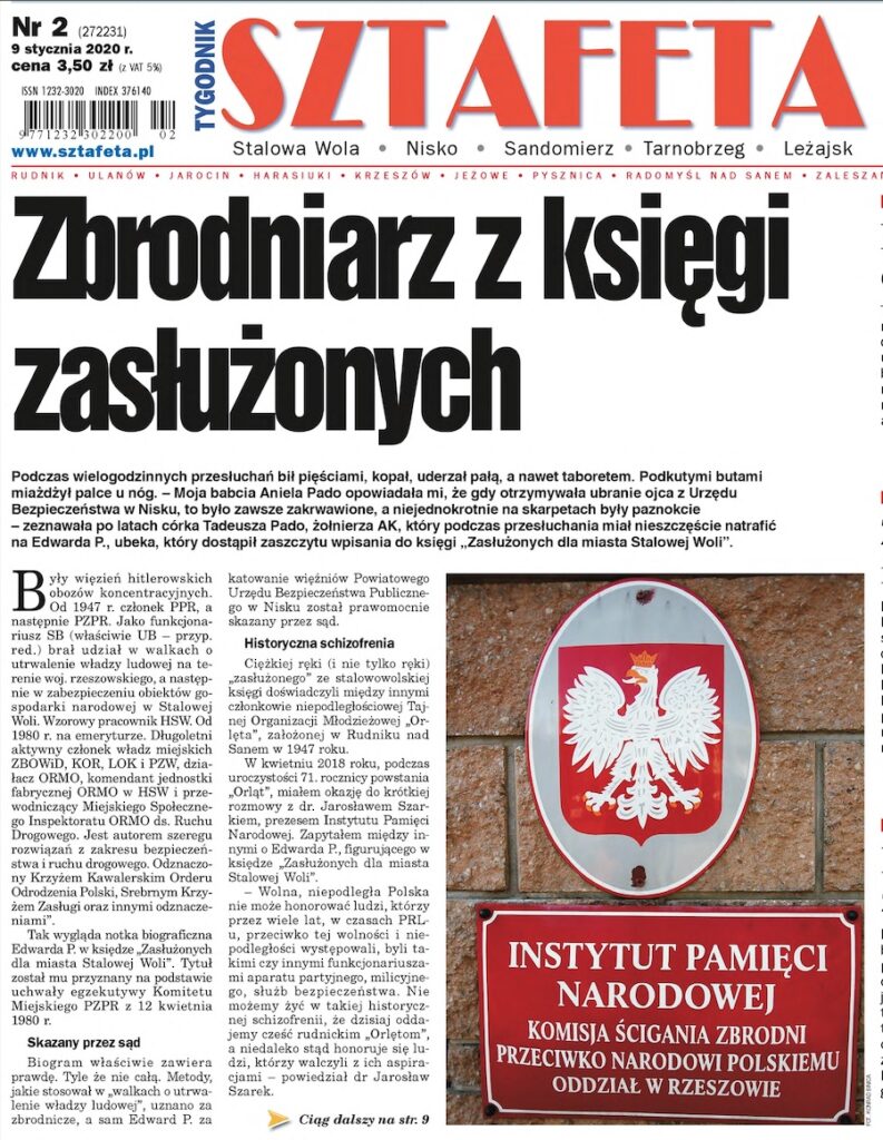 Edward P. o którym pisała 6 lat temu na pierwszej stronie gazeta „Sztafeta” w artykule pt. „Zbrodniarz z księgi zasłużonych” (przeczytasz poniżej) to były funkcjonariusz komunistycznych służb Edward Piela. Ponieważ w 2020 roku Edward Piela jeszcze żył, gazeta nie użyła jego pełnego nazwiska. Gazeta nie tylko w ten sposób prawdopodobnie chroniła się przed ewentualnym procesem sądowym, ale tym samym uchroniła zbrodniarza przed publicznym zniesławieniem.
